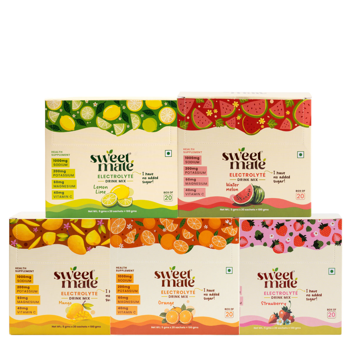 All our Sweetmate Electrolyte are there to help you to capture the deal to stay hydrated without the unwanted sugar. Infused with vital electrolytes such as sodium, potassium, and magnesium, this formula helps you to restore the depleted nutrients, boost your energy levels, and serves the best for your muscle health. Wait all this happens when you are light on calories and free of any guilt! What you need to do? Just mix 1 stick pack of this zesty combination with 500 ml of water. Whether you're an athlete, fitness enthusiast, or have a hectic schedule, Sweetmate Electrolytes ensures you stay hydrated, refreshed, and prepared to tackle any challenges that come your way.